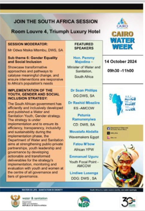 Join us tomorrow from 09h30 to 11h00 as we, Department of Water and Sanitation, host a technical session under sub-theme 6: Gender Equality and Social Inclusion.